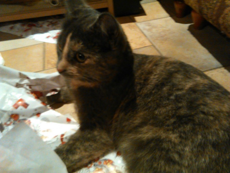Pelēka ar rudu, atsaucas uz vārdu Strīpa. Uz purniņa ir balta svītra.