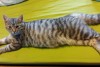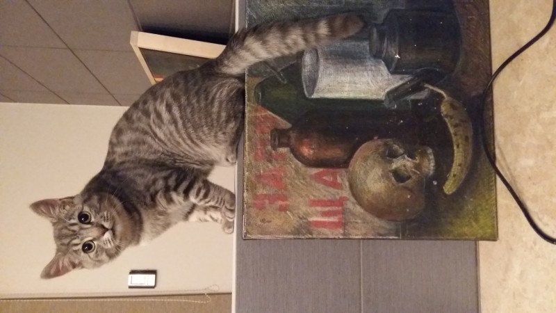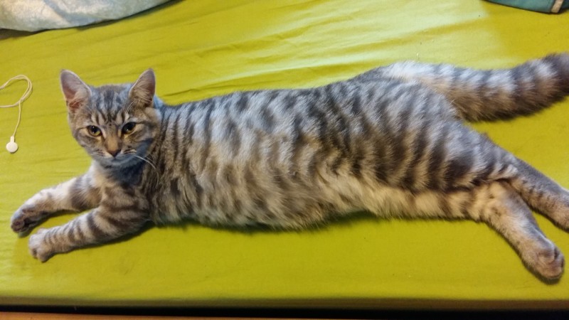 Pelēks, ar gaišām svīrtām. Zila kaklasiksna. Atsaucas uz vārdu Kirils.