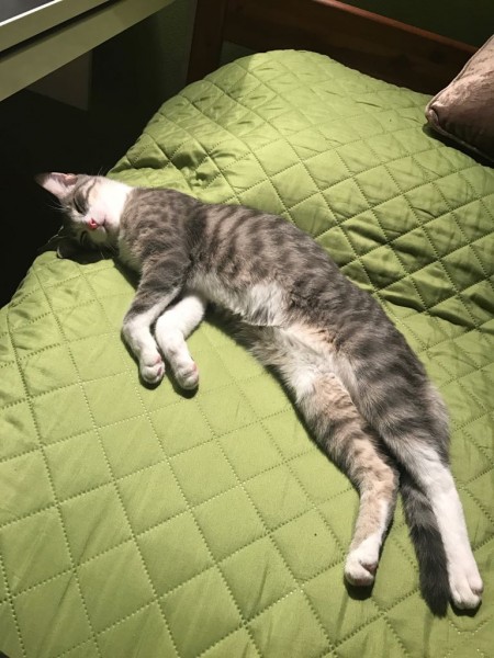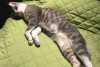 Pelēks , raibām strīpām un baltām ķepiņām , jauns runcītis, slaids ar baltu kaklu un vēderu. Nepilnus 9 mēnešus vecs. Ļoti mīļš, draisks, droši ļaujas citiem rokās...nav agresīvs