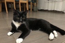Melns kaķis ar veselīgu spalvu, baltām ķepiņām, vēderu un ūsām. Dzeltenīgas/brūnas actiņas. Ļoti aktīvs, patīk spēlēties un ķert.