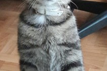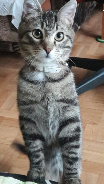 Pelēks ar strīpām, balta siksniņa ar pērlītēm, jautrs un mīļš.
