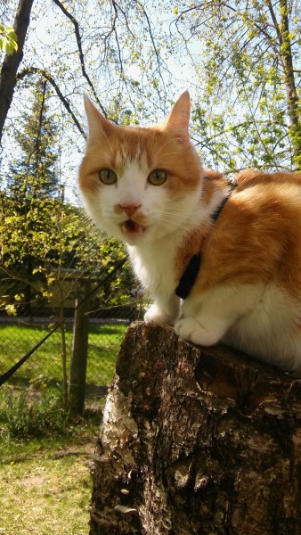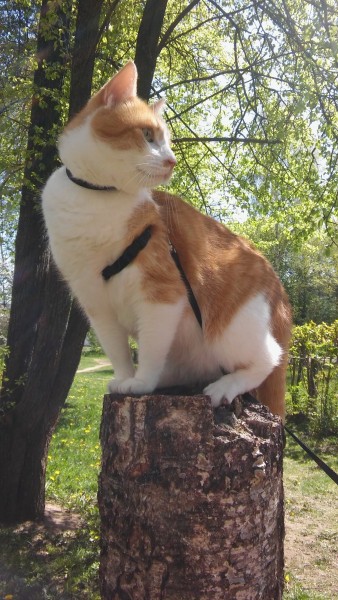 Ruds kaķis ar baltu pavēderi un svītrainu astes galu. īsspalvains, paliels savas sugas pārstāvis (ap 7-8 kg).