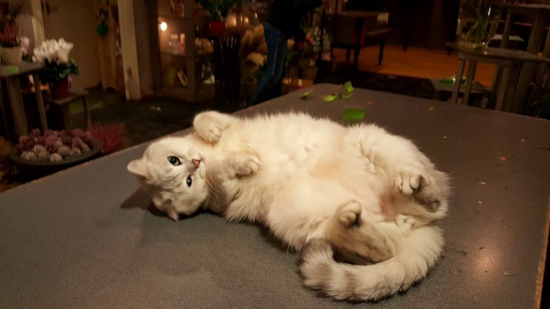 Gaiši, gaiši pelēks ar baltu Britu īsspalvainais kaķis, vārdā Pepe.