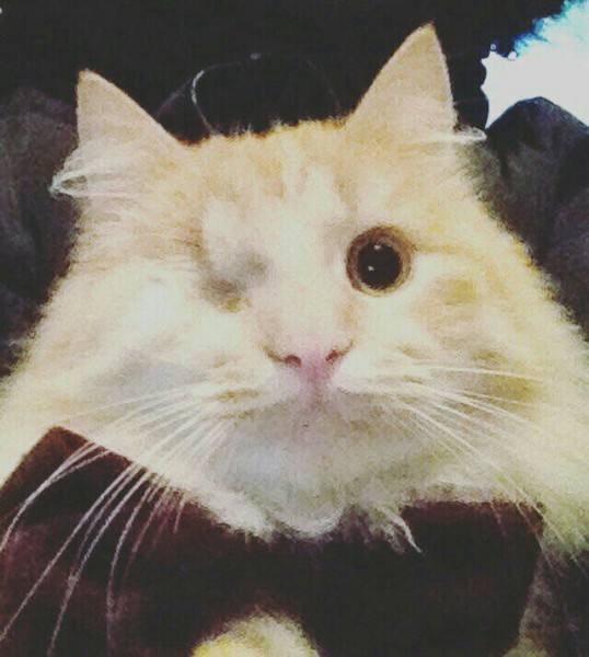 Rūds,pūkains kaķis ar vienu aci.