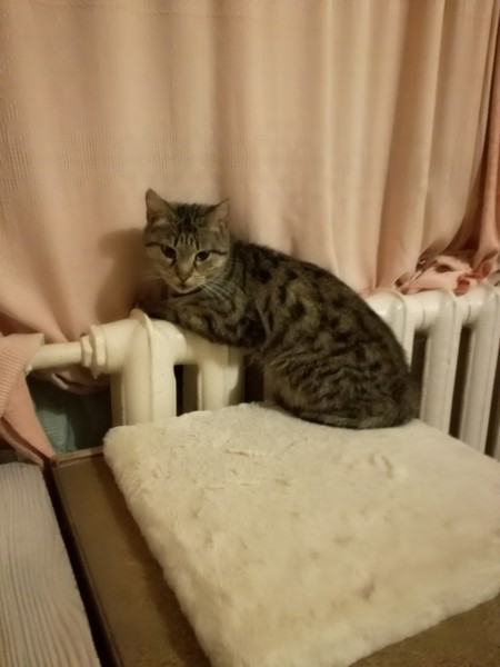 Strīpaina kaķenīte austiņas nedaudz ar krevelītem, balta mutite ar melnu lasiti uz apakšlūpas. Pazuda 17.marta vakarā.