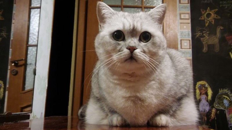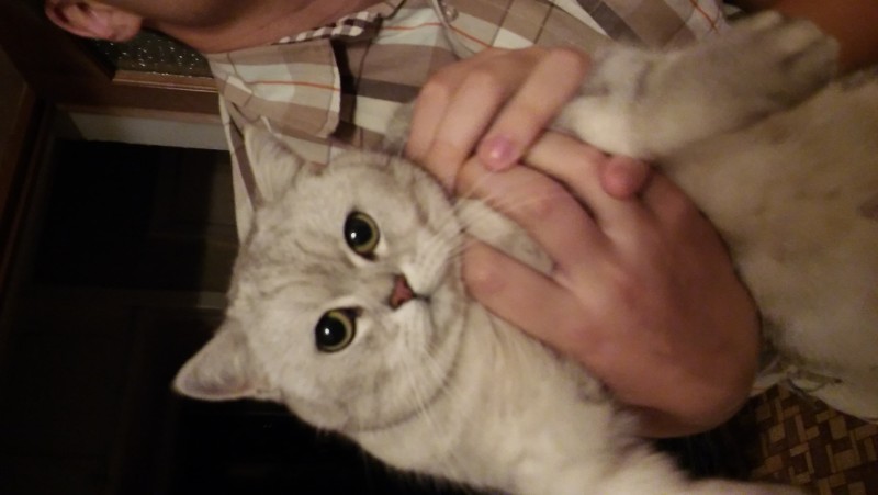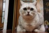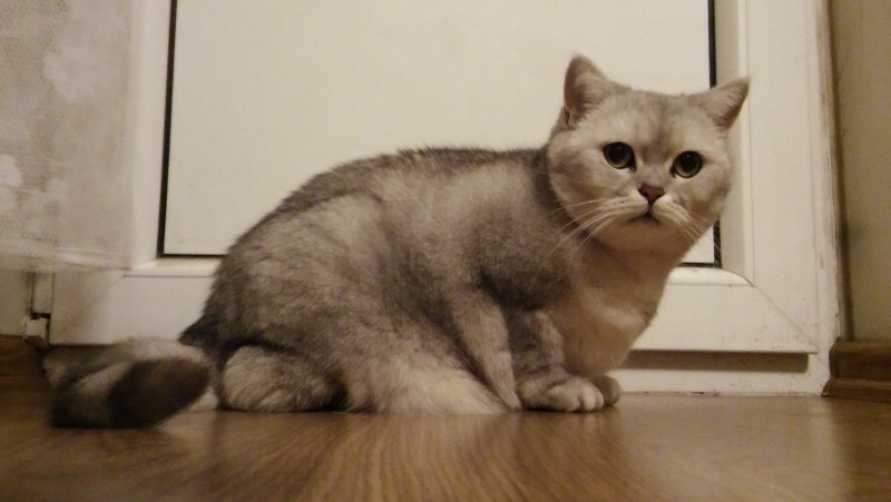 Kaķene ar gaiši pelēku, biezu kažoku. Uz vēdera nokarājusies āda.
