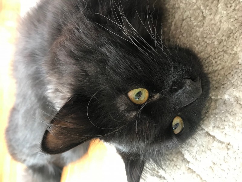 Melns, pūkains, acis iekš dzeltena, bet jaucas ar zaļo krāsu, sabiedrisks, mīļš, ziņkārīgs, draudzējās ar suņiem. Bet varbūt šobrīd ir stresā, bailīgs. Ap kaklu palielāka izmēra kakla siksniņa,rozā krāsā, iekšā ir ierakstīts telefona numurs, adrese.