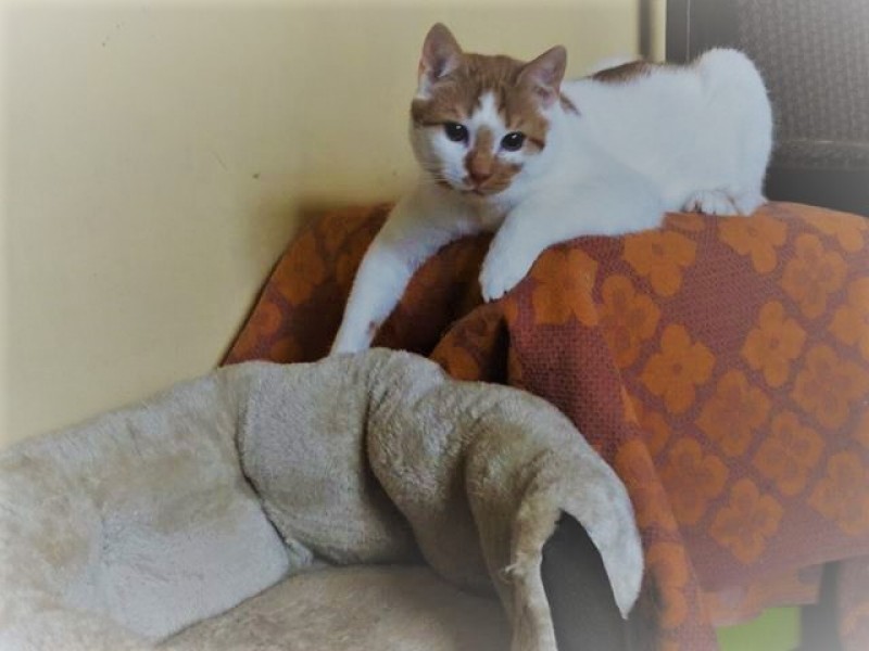 Kaķis balts ar rudiem krāsas plankumiem.Ap kaklu pretblusu siksniņa