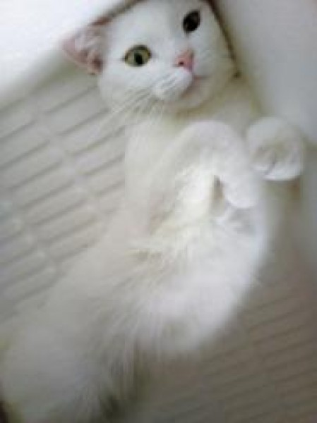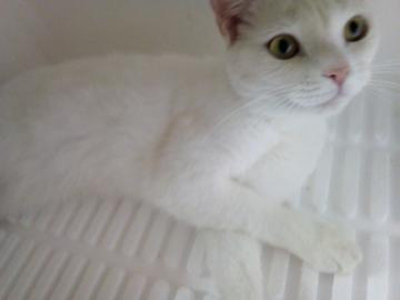 Pilnīgi balts, zaļas acis, rozā deguns, ausis. Kaķis ir kurls un neatsauksies, Siksniņas nav, jo pirms pazušanas bija to, diemžēl, nokabinājusi. Pazuda 17. 06. rītā, vecmīlgrāvī