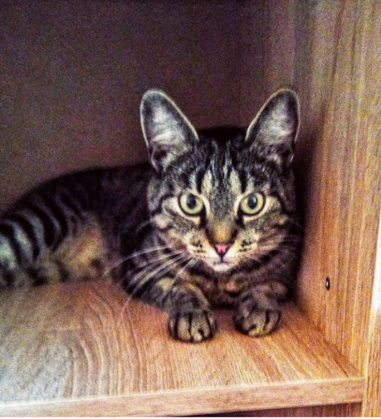 Dūmakaini pelēka kaķene ar simetriski izvietotām strīpām un plankumiem. Uz krūtīm ir mazs balts plankumiņš. Atsaucas uz vārdu Marija.