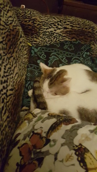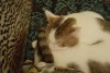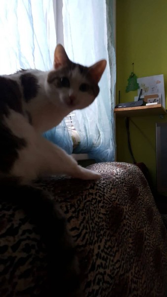 Balts kaķis ar pelēkiem plankumiem, aste svītraina, gara, deguns nedauz melns.