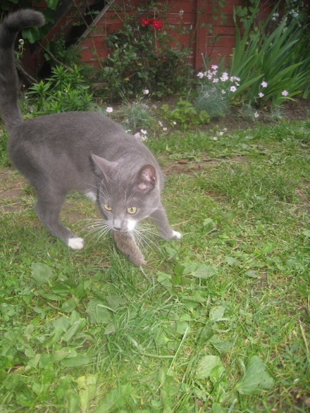 Ļoti mīlīgs, jauns ručuks - pelēks ar baltām ķepiņām un purniņu. Ap kaklu bija gaiši pelēka blusu kakla siksniņa.