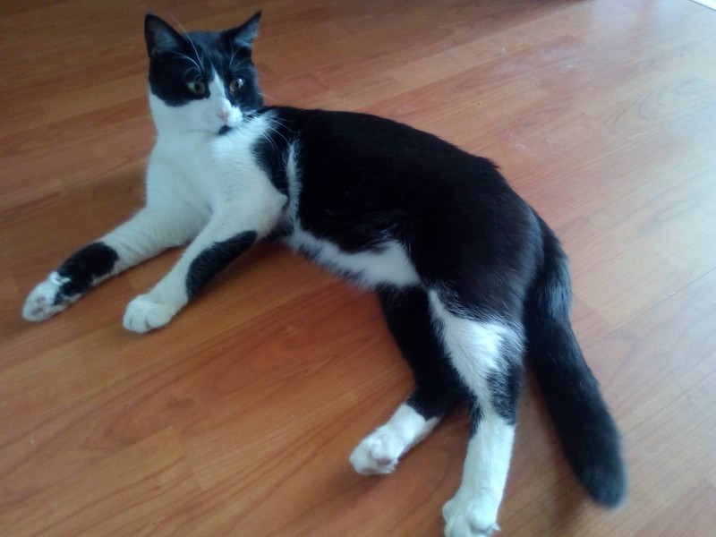 Mugura melna, viss pārējais asimetriski melnbalts, vienai priekšējai ķepai spiventiņš divkrāsains, melnā spalva spīdīga, uz vēdera sataustāma maza pumpiņa, astes galiņā dažas baltas spalvas. Vārdā Fils