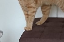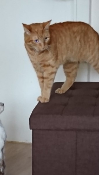 Ruds, bez baltumiem,dzintara krāsas acis, astes galiņš gaišāks. Ap kaklu bija divas siksniņas, vienai klāt paliela zaļa bantite.Ļoti bailīgs, bet var ļauties aiztikt un pienāks klāt ja cilvēks pietupsies.Monijs.