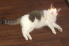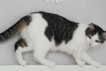 Mājas kaķis. Smalkas miesasbūves kaķene. Īpašas iezīmes - Nav kreisās auss galiņš, pats astes galiņš ir balts.