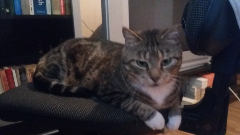 Tīģerkrāsas kaķene, īpaša pazīme-nogriezts kreisās austiņas stūris (sterilizēts ielu kaķis, paņemta no patversmes pirms vairāk kā gada. Ļoti mīlīga, baidās no suņiem un citiem kaķiem, rokās svešiem nedodas. Atsaucas uz vārdu Mika.