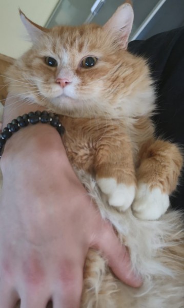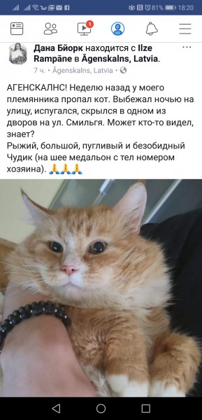 Lielss, pūkains, ruds kaķis ar baltu purniņu, balts vēders un ķepiņas. Bailīgs. Liels purniņš.