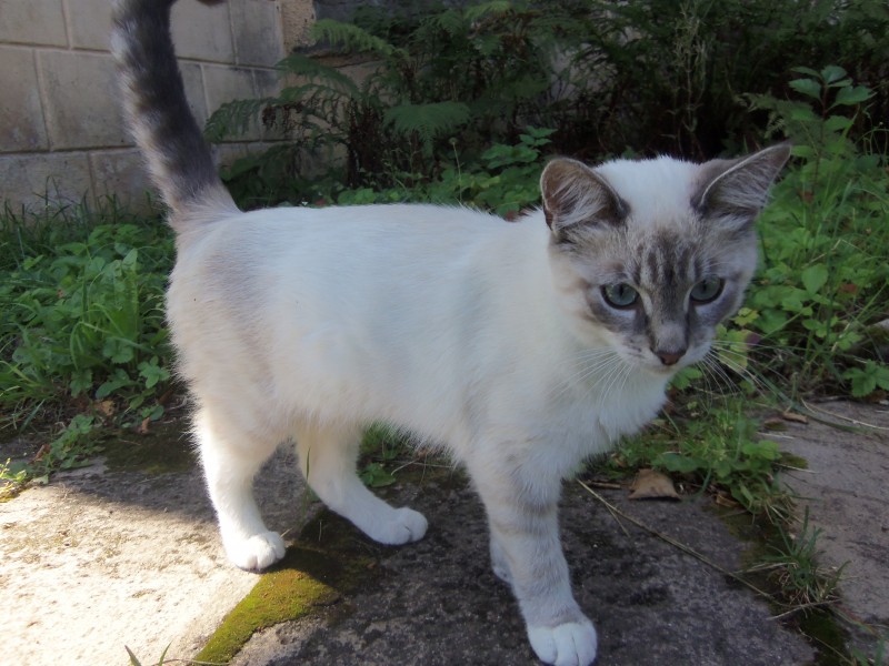 pelēcīgi balts, galviņa un aste ar tumšām šķērssvītrām, normāli barots. Vārds Asteriks