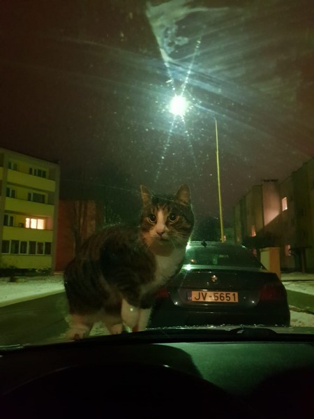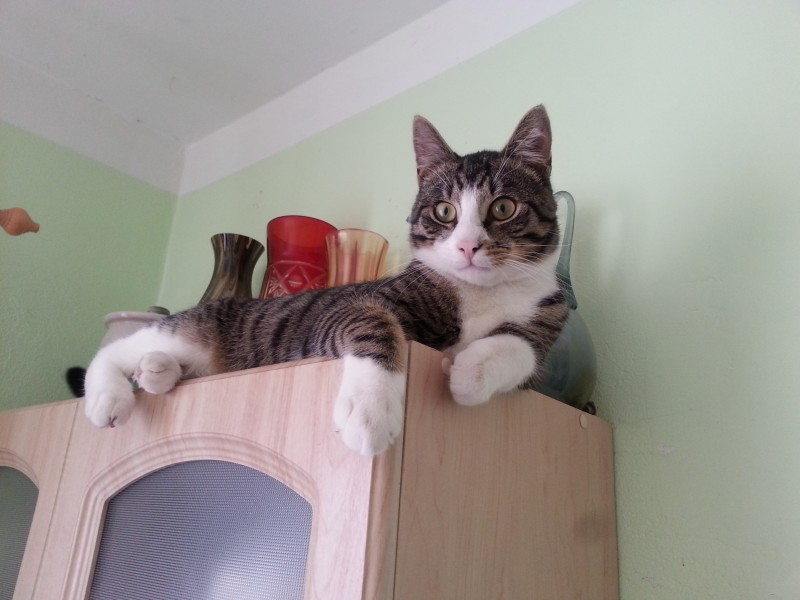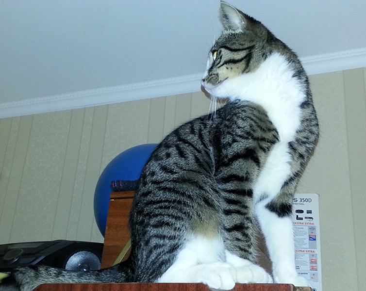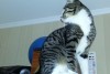 Pelēki strīpains kažoks, balts purniņš, balta pavēdre un baltas ķepas