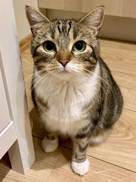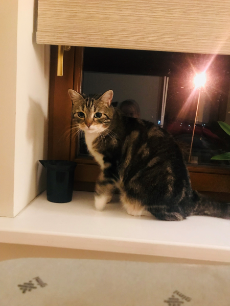 Pazuda 27.02 no rīta no Apogciema( netalu no Jaunciema gatves) brūni melni plankumaina ar baltu krūtiņu un melnu astes galu. Kaķenīte atsaucas uz vārdu Nora.Ap kaklu -rozā siksniņa ar piekarinu-grabulītis un metālisks piekariņš ar Vārdiņu un tel.nr