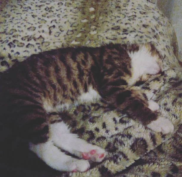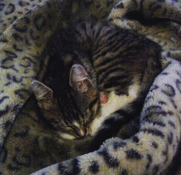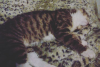 Полосатая кошечка с белыми пятнами. Белые лапы. Оранжевые глаза. Кличка Айя. Пугливая, застенчивая.