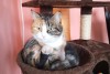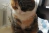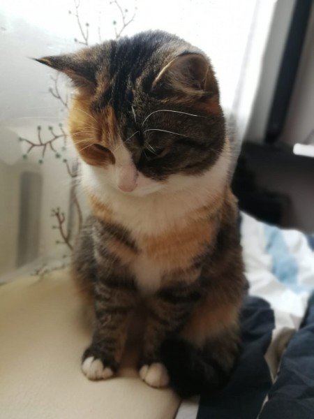 Gaiša trīskrāsaina kaķenīte. Purniņa kreisā puse rūsganā krāsā.