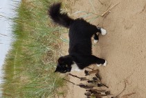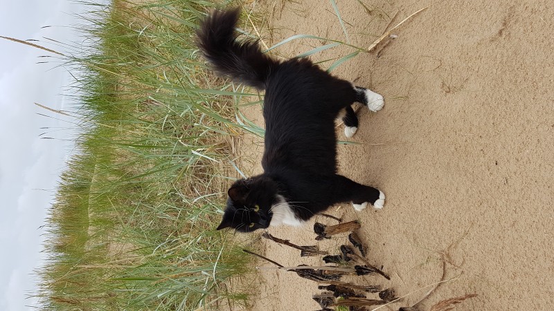 Пушистая, чёрно-белая кошка с красным ошейником, отзывается на имя Мице
