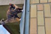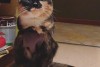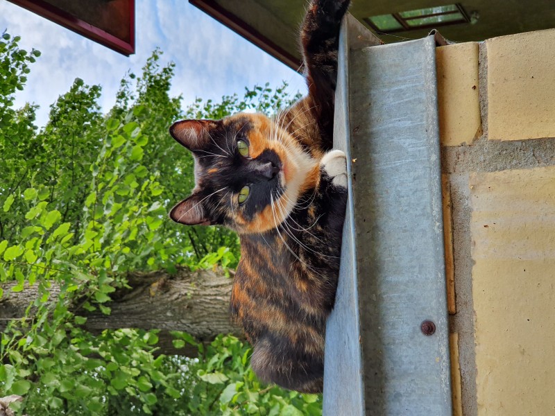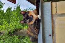 Maziņa ar raibu kažoku un baltām ķepiņām.