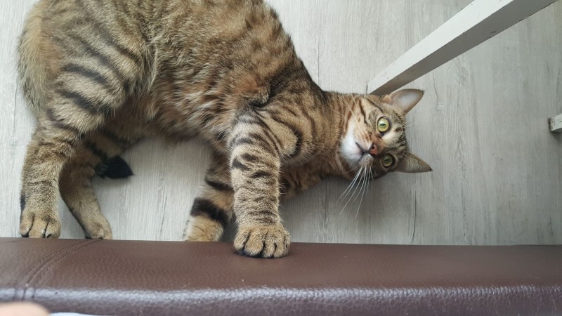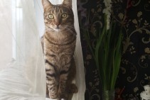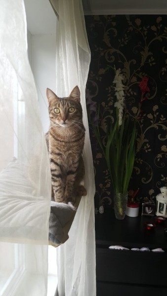 Kaķim ir ļoti tipiskas krāsas. Pelēks ar melnām svītrām, zodiņš balts un vēderiņš tāds rudi brūns. Kaķis ir diezgan bailīgs. Atsaucas uz vārdu Lancelots, bet šajā situācijā var neatsaukties.