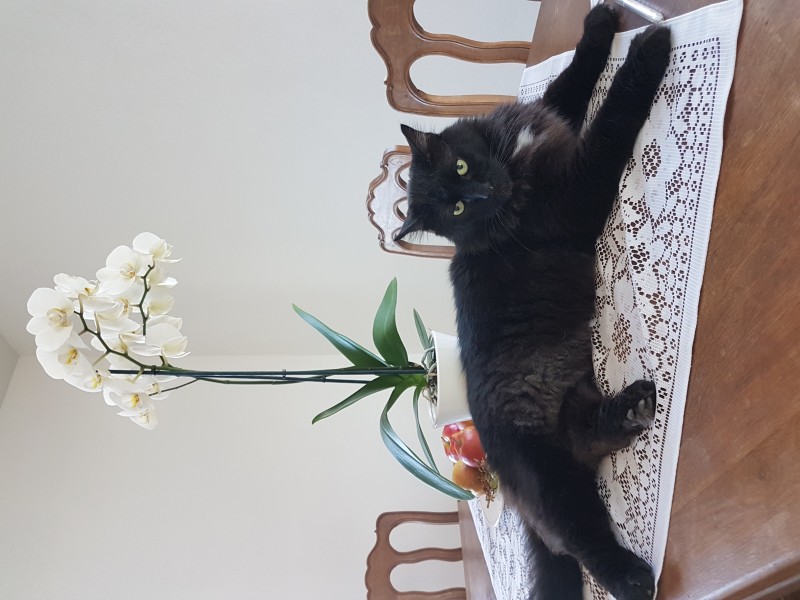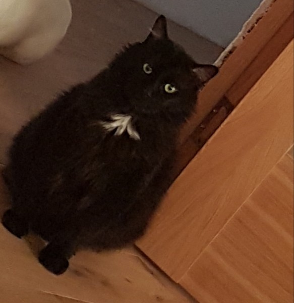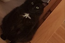 Melns ar baltu pazodi. Draudzīgs. Liels. ir siksniņa (ja nav pazaudējis).