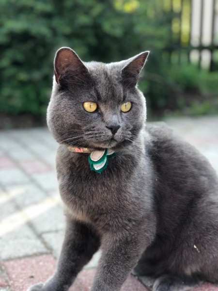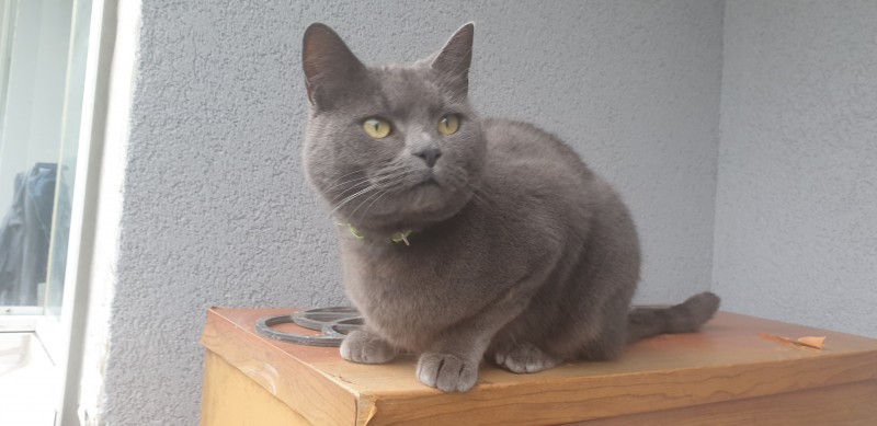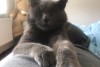 Pelēk zils kaķis. Līdzīgs britu sugai. Zaļas acis. Iespējams ir apkakle (ar atstarotāju)