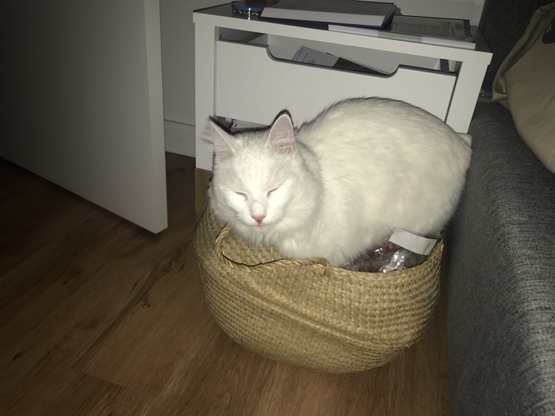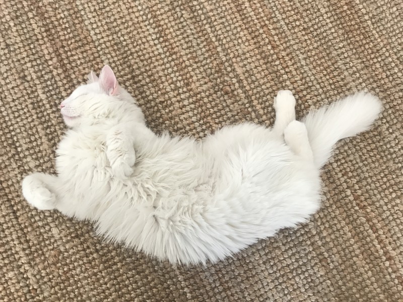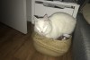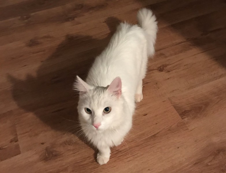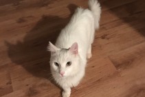 Balts runcis, apmēram 3 gadus vecs, pilnīgi kurls. Uz deguna ir maza rētiņa, acis dzeltenīgas.