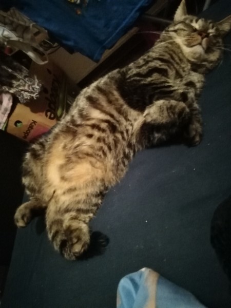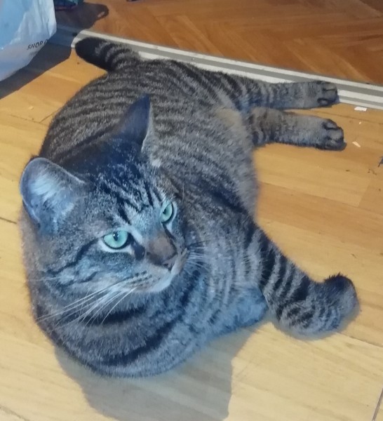 Pelēki svītrains, melnā krāsa vairāk nekā pelēkā, uz muguras melna, plata josla, izteikti svītrains - 26 svītras, uz pieres M burts, vēders brūngans, nokarājies. Ļoti draudzīgs.