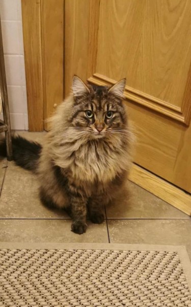 Atsaucas uz vārdu Miksis, ļoti kupla aste, visas četras kājas no aizmugures melnas, ļoti draudzīgs un ziņkārīgs.