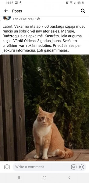 MĀRUPĒ/TĪRAINĒ Gaiši ruds, gudrs runcis. Vārdā Oldess. Uz deguna dzimumzīme.
