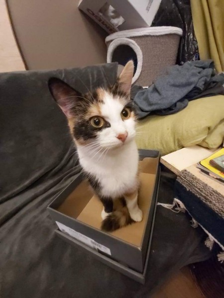 Trīskrāsu, katra ķepa savā krāsā, melna un balta. Krāsas - ruds, balts, melns. Actiņas arī atšķirīgas, M burts uz pieres, lielas austiņas, smalka, maziņa.Atsaucas uz vārdu Feja.