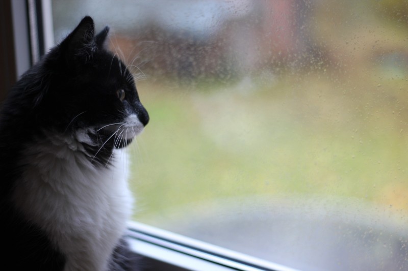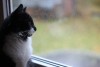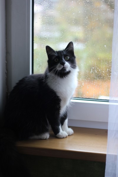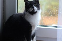 Melns runcis, balta krāga, kupla aste, melna pretblusu siksniņa.
