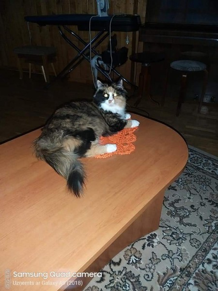 Trīskrāsu, pusgarspalvaina, melnas priekškājiņas ar baltām zeķītēm