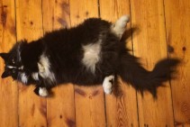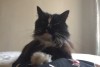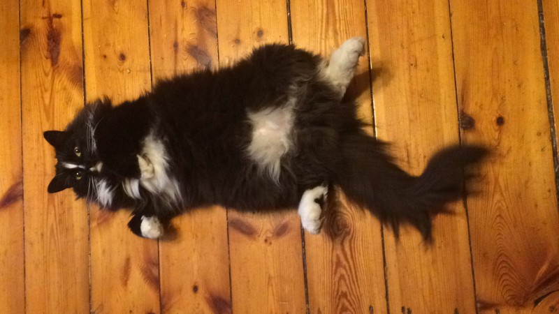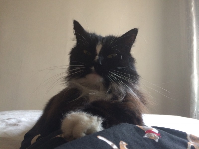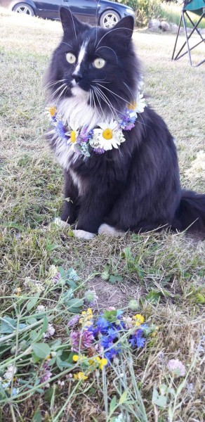 Melns ar baltām ķepiņām, punci un purniņu, melnums sānos iebrūns, iepelēks. Spalva gara un pūkaina, acis gaiši zaļas, kuplas ūsas un uzacis.