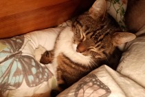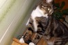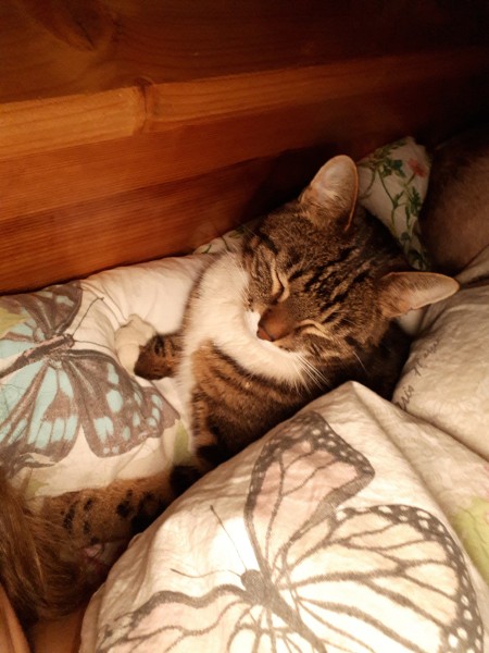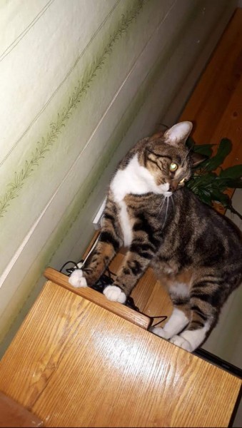 Raibs kā maza mežacūka. Ļoti draudzīgs un drosmīgs kaķis. Atsaucas uz vārdu Brūss, bet, iespējams, ka intonācija nozīmīga, lai kaķis tiešām atsauktos.