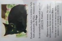 Viscaur melna kaķene, uz krūtīm balts. Bez čipa, jo nekad laukā no dzīvokļa nav gājusi. Sterlizēta, 7.gadus jauna. Var vai nu baidīties, bet gluži pretēji, aiz pārbīļa doties līdzi jebkuram cilvēkam.