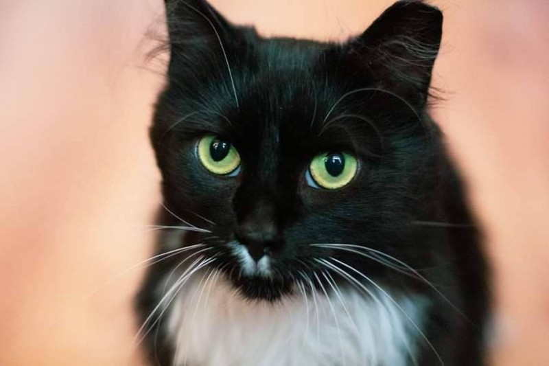 Melni-balts, pūkains, ar apgrieztu kreisās auss galiņu.