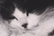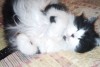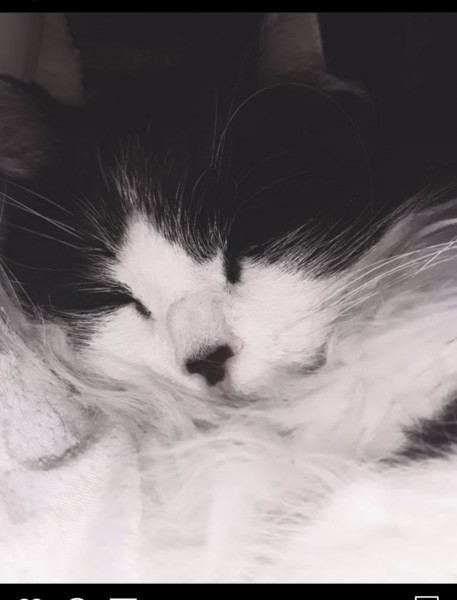 Melnbalta pūkaina kaķene Simona. Ar melnu sirsniņu uz deguna.