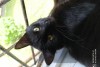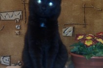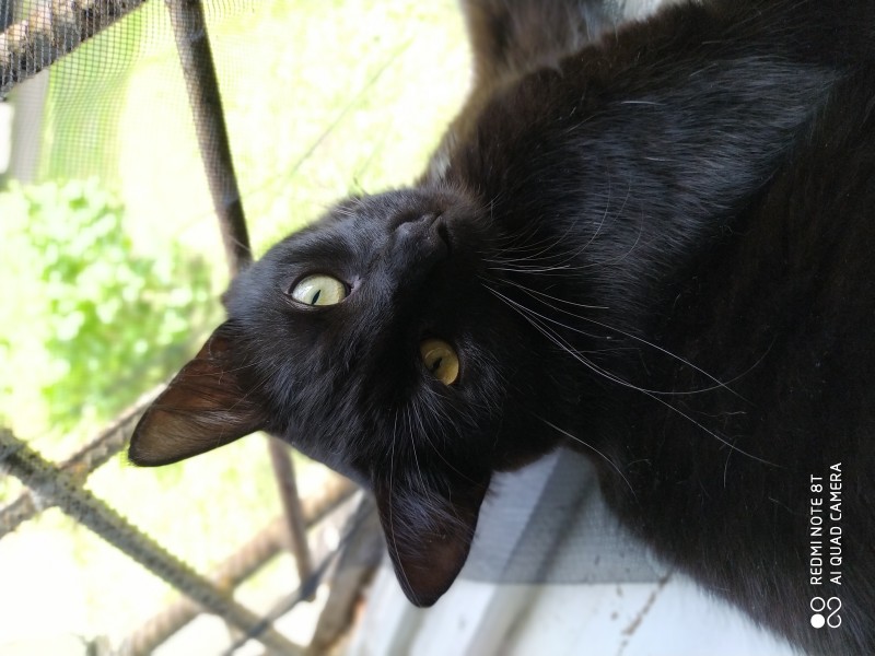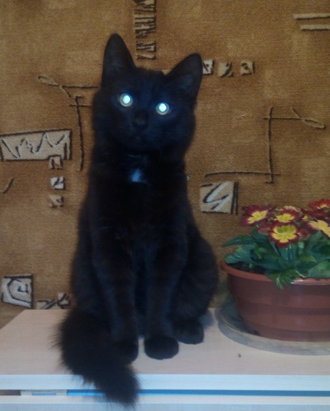 Чёрный с маленьким белым пятнышком на груди. Гладкая шкурка, но очень пушистый хвост.