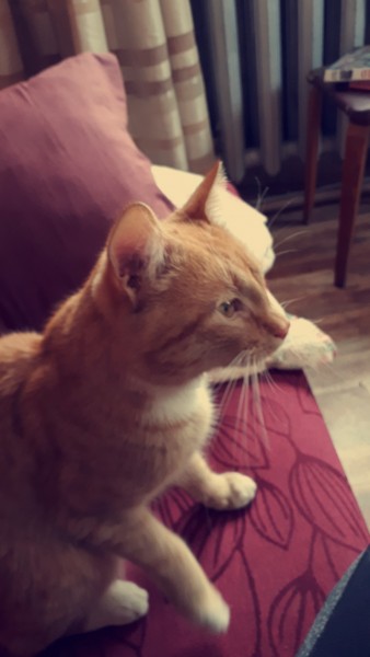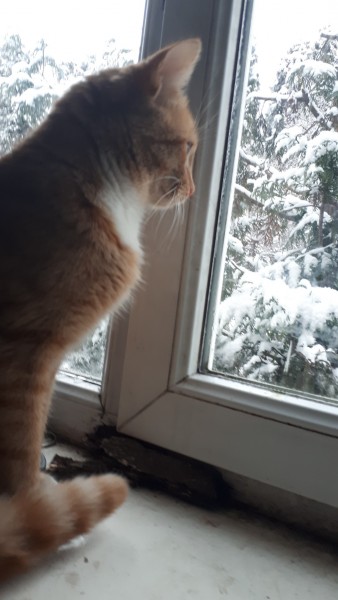 Ruds ar gludu spalvu, brūngan zaļas acis, ar baltu vēderu, nedaudz baltu krūtiņu un baltas ķepiņas. Un izteikti garš kaķis. Atsaucas uz vārdu Rūdis.