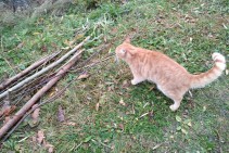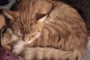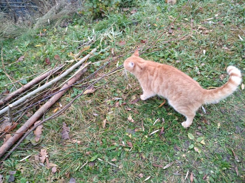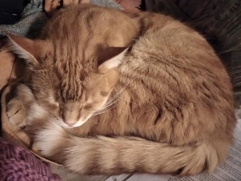 Rudi strīpains īspalvains kaķis bez kakla siksnas (nav baltas ķepas un nav balta apkakle). Atsaucas uz vārdu Romis.