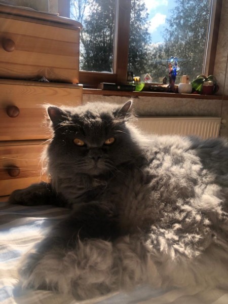 Britu zilais garspalvains, pec čipa var atrast īpašnieka tel. nr.
