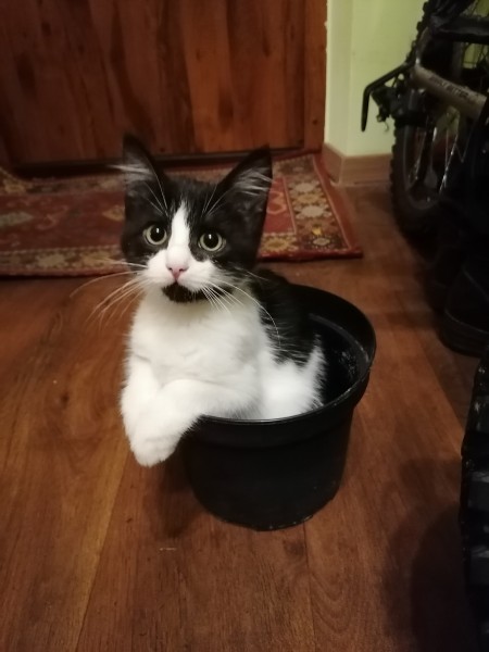 Melnbalta, balts purniņš, melns zodiņš, uz melnās muguras baltumiņš, kā lāsīte izskatās, uz pleca labajā pusē apaļš melnums. Vārds Poga.