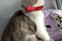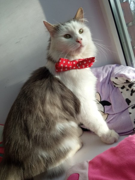 Balts ar pelēku, garspalvains ar kuplu asti.