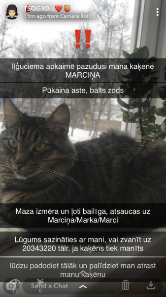 Pazudusi kaķene Iļģuciema apkārtē. Atsaucas uz Marka/Marciņa. Maza izmēra, ļoti bailīga. Balts zods un pūkaina lemūrveidīga aste.